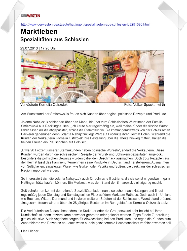 Unser Angebot umfasst alle traditionellen Wurstsorten und die dazu passenden ergänzenden Artikel aus der unverfälschten polnischen und schlesischen Küche wie z.B. Sauerkraut vom Faß (Kapusta), Bigos, Salzgurken, Rote Beete, Meerrettich, Senf, Pierogi, Zurek, Griebenschmalz und polnische Zeitschriften. Außerdem finden Sie in unserm Sortiment ausgesuchte Pralinenspezialitäten, Naturhonig, Twaróg (Weißkäse) nach traditioneller Art aus Polen.